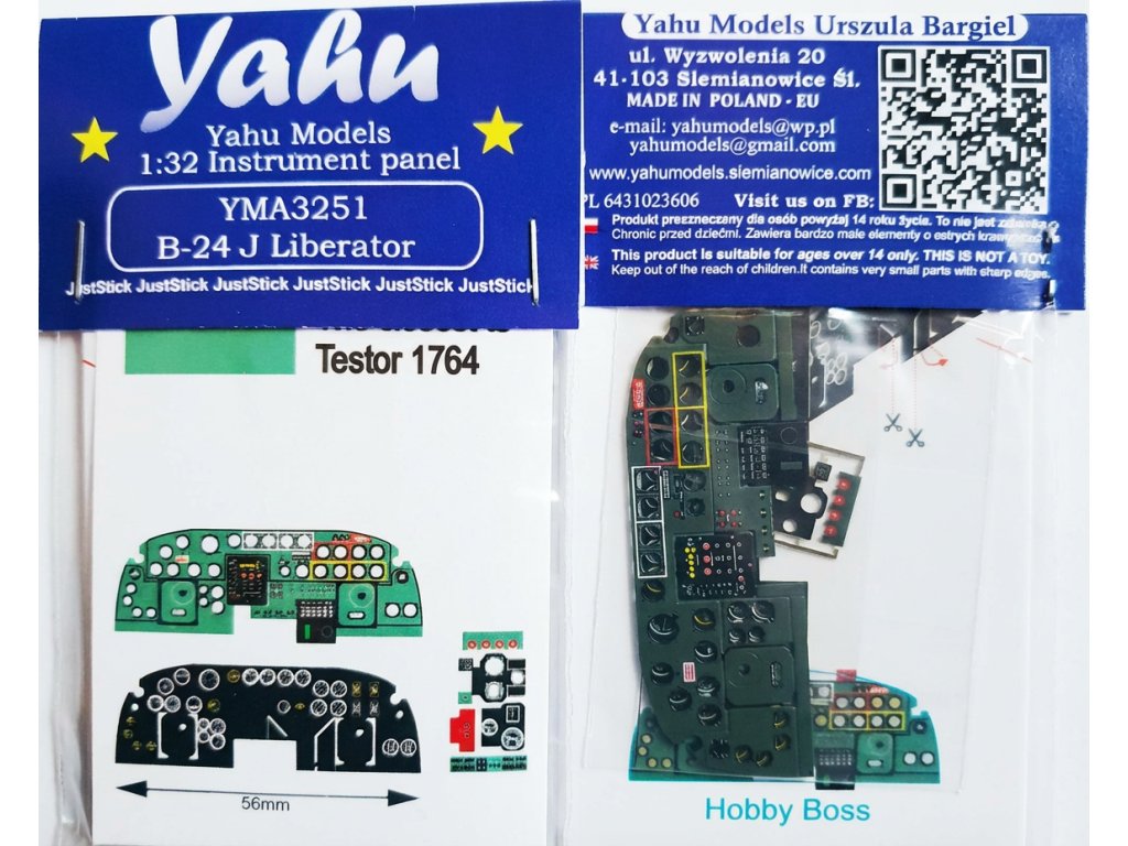 Yahu Models 1/32 B-24 J je fotolepený přístrojový panel určený pro stavebnici Hobby Boss Consolidated B-24J Liberator v měřítku 1:32. Doplněk nahrazuje plastový panel detailnějším provedením s vyobrazenými přístroji a ciferníky, čímž zlepšuje vzhled kokpitu amerického těžkého bombardéru z období 2. světové války. Vyžaduje základní zkušenosti s instalací fotolepených dílů. Balení neobsahuje barvy ani lepidla potřebné k instalaci.