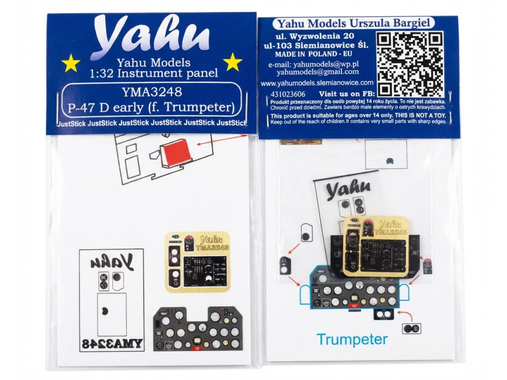Yahu Models 1/32 P-47 D early recommended for Trumpeter Republic P-47D Thunderbolt Early je fotolepený přístrojový panel určený pro plastikové stavebnice Republic P-47D Thunderbolt v měřítku 1:32 od výrobce Trumpeter. Doplněk nahrazuje standardní plastové díly detailnějším provedeným z fotoleptaného kovu a umožňuje dosáhnout vyšší úrovně detailu kokpitu. Vyžaduje základní zkušenosti s lepením fotoleptů a použití vhodného lepidla (např. CA vteřinové lepidlo nebo lepidlo na fotolept). Balení neobsahuje barvy ani lepidla potřebné k sestavení.