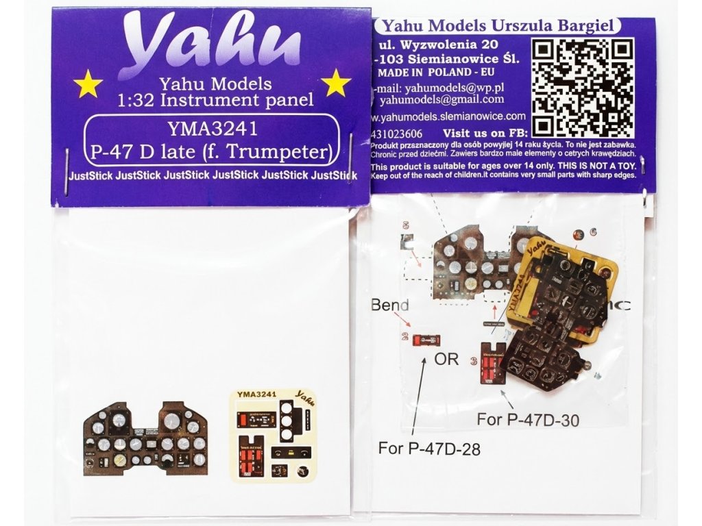Yahu Models 1/32 P-47 D late je sada fotolepených přístrojových desek pro stavebnici Trumpeter Republic P-47D Thunderbolt late v měřítku 1:32. Díly jsou barevné a připravené k přímému nalepení (technologie JustStick), což zjednodušuje detailní zpracování kokpitu bez nutnosti malování jednotlivých přístrojů. Stavebnice barev ani lepidla neobsahuje.