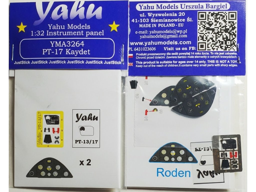 Yahu Models 1/32 PT-17 Kaydet je fotolepený přístrojový panel v měřítku 1:32 určený jako doplněk ke stavebnicím Roden Stearman PT-17/N2S-3 Kaydet (kompatibilní s výrobci ICM, Academy a Ukraina). Obsahuje barevně potištěné přístrojové desky s jemnými detaily, které nahrazují plastové díly a zvyšují realističnost kokpitu. Balení neobsahuje barvy ani lepidla potřebné k instalaci.
