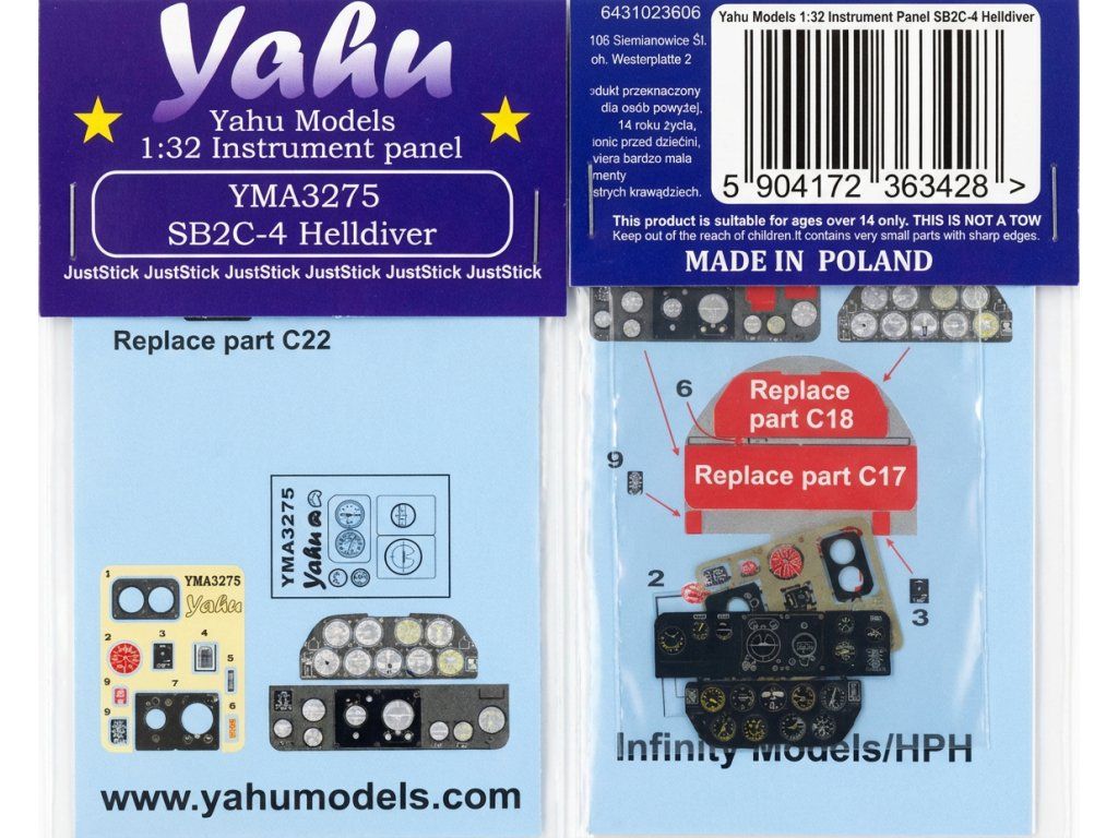 Yahu Models 1/32 SB2C-4 Helldiver instrument panel je fotolepený doplněk přístrojové desky pro stavebnice Curtiss SB2C-4 Helldiver v měřítku 1:32 od Infinity Models. Nahrazuje plastové díly detailnějším provedeným pomocí fotoleptání a umožňuje dosáhnout vyšší úrovně detailu v kokpitu. Balení neobsahuje barvy ani lepidla potřebné k instalaci.