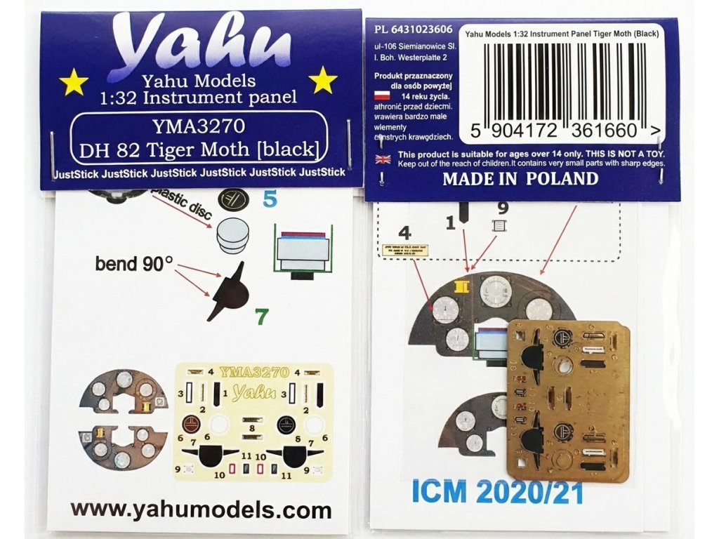 Yahu Models 1/32 Tiger Moth je fotolepený přístrojový štítek v černém provedení určený jako doplněk ke stavebnicím de Havilland Tiger Moth od ICM v měřítku 1:32 (verze Mk.I a Mk.II). Nahrazuje plastové díly kokpitu a přináší vyšší detailnost a realističtější vzhled přístrojové desky. Instalace vyžaduje základní zkušenost s fotoleptanými díly a vhodné lepidlo (např. vteřinové nebo speciální pro fotoleptu). Balení neobsahuje barvy ani lepidla.