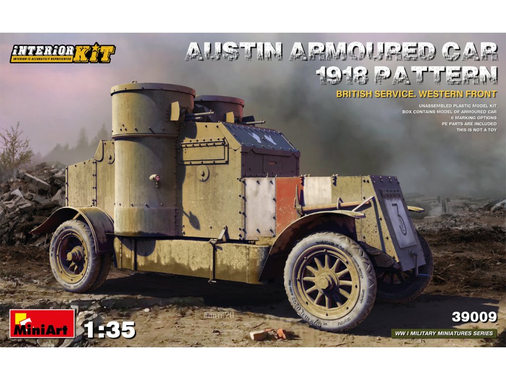 Model Austin Armoured Car 1918 Pattern v britských službách na západní frontě v měřítku 1/35 od MiniArt zachycuje jednu z posledních verzí tohoto ikonického obrněného automobilu nasazovaného během první světové války. Stavebnice obsahuje detailní plastové díly a kompletní interiér. Balení neobsahuje barvy ani lepidla potřebné k sestavení.