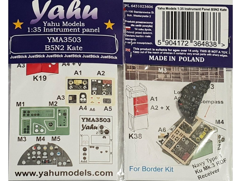 Yahu Model 1/35 B5N Kate je sada předmalovaných fotolepených přístrojových desek určená pro stavebnice Nakajima B5N2 Type 97 "Kate" od Border Models. Součástí je leptaný panel s barevně zpracovanými přístroji, který nahrazuje plastové díly a zvyšuje detailnost kokpitu. Balení obsahuje předmalované leptané díly připravené k instalaci.