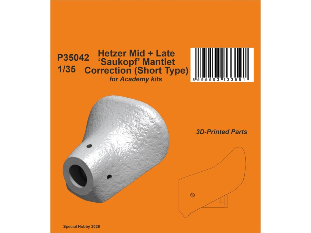 CMK 1/35 Hetzer Mid + Late 'Saukopf' Mantlet Correction (Short Type)/for Academy kits je resinový doplňkový set určený k vylepšení plastikových stavebnic tanku Jagdpanzer 38(t) Hetzer od firmy Academy v měřítku 1:35. Set obsahuje přesnější provedení charakteristického pancéřového krytu hlavně typu „Saukopf" (prasečí hlava) v krátké variantě, která byla používána na středních a pozdních výrobních sériích vozidla. Díky tomuto doplňku lze dosáhnout vyšší historické přesnosti a detailu než s původními plastovými díly. Balení neobsahuje barvy ani lepidla potřebné k sestavení.