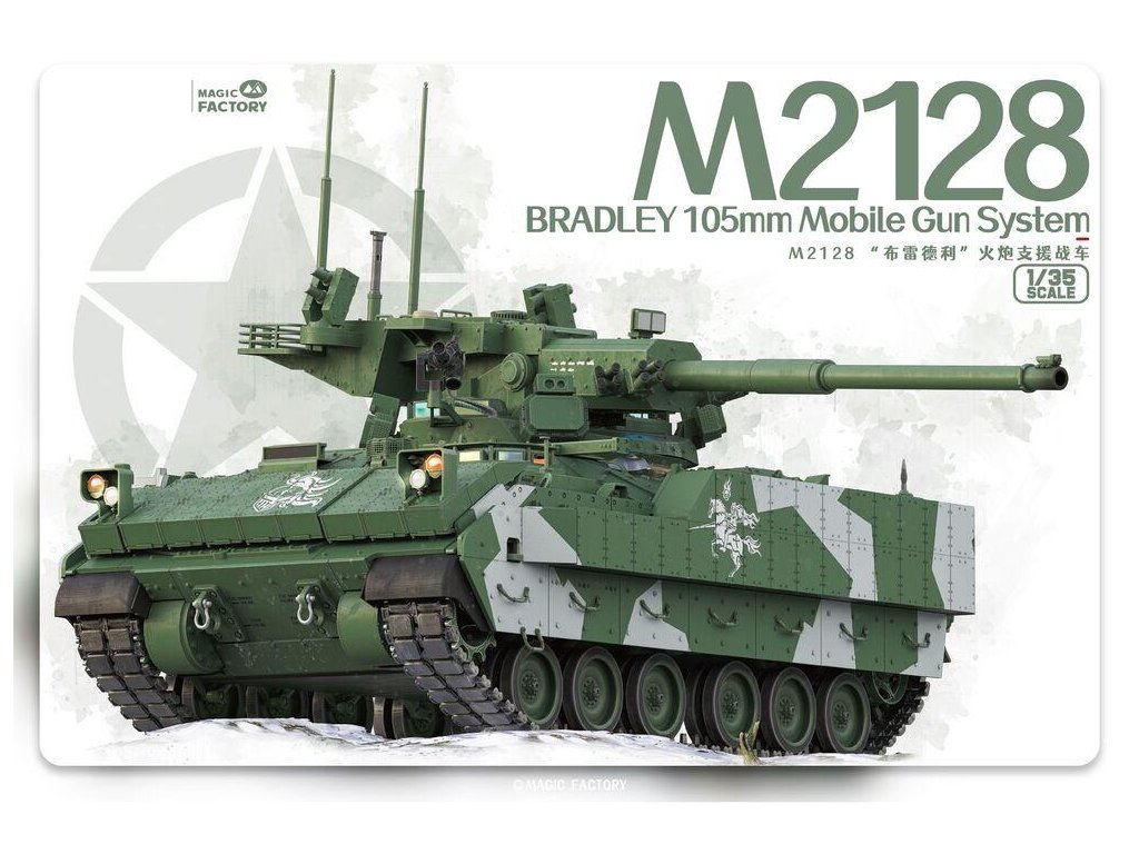 Magic Factory 1/35 M2128 Bradley 105mm Mobile Gun System je detailní plastiková stavebnice experimentální verze vozidla Bradley osazeného 105mm kanónem. Model nabízí jemně zpracované detaily, realistické prvky a bohaté příslušenství. Balení neobsahuje barvy ani lepidla potřebné k sestavení.