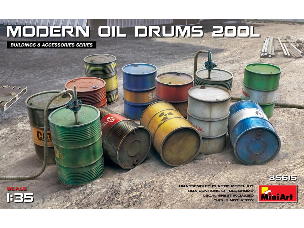 Sada Modern Oil Drums (200l) v měřítku 1/35 od firmy MiniArt obsahuje plastové díly k sestavení realisticky provedených sudů běžně používaných pro skladování a přepravu paliv, olejů a dalších kapalin. Tyto válcové ocelové sudy jsou ztvárněny v moderním stylu a odpovídají typům používaným od poválečného období až po současnost v armádě, průmyslu i civilním sektoru.