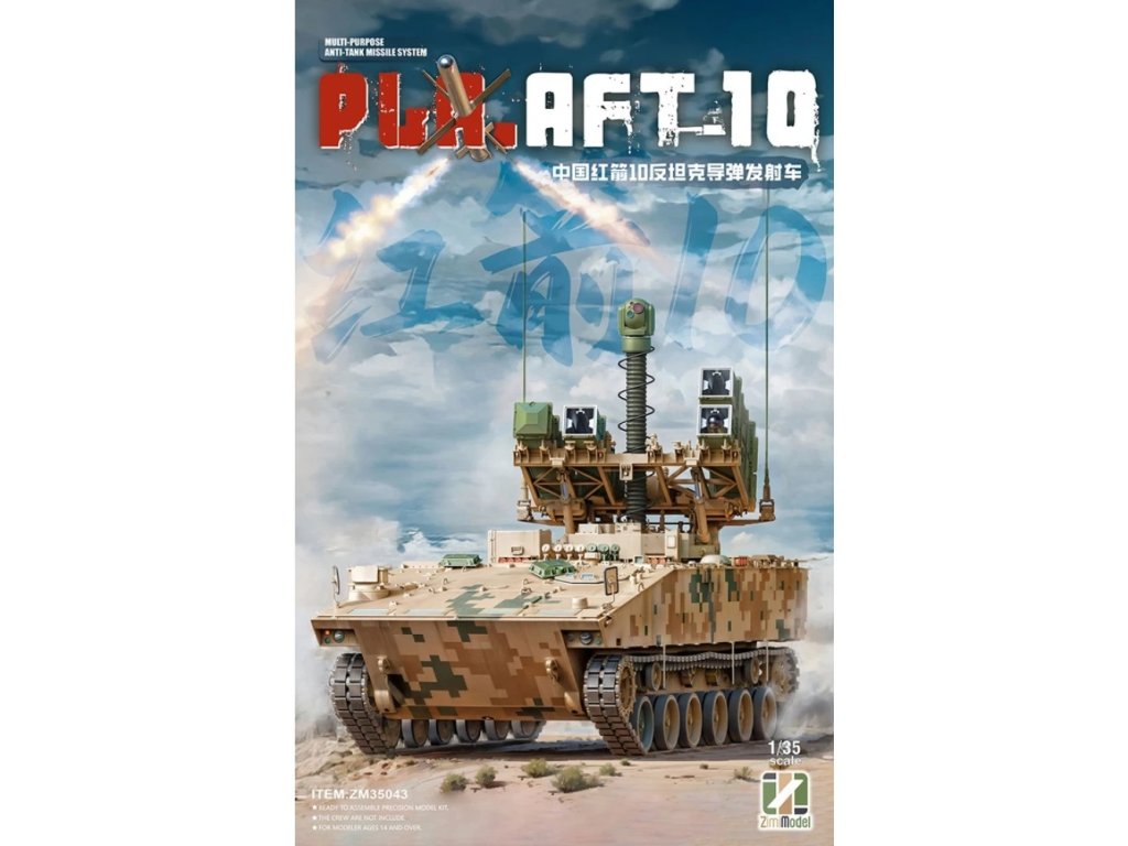 Zimi Model 35043 1/35 PLA AFT-10 Multi-purpose Anti-tank Missile System je plastikový model čínského samohybného protitankového raketového systému určený ke slepení. Stavebnice nabízí funkční pásy umožňující realistické znázornění pohybu, funkční odpružení podvozku simulující chování vozidla v terénu a nastavitelný raketový odpalovač se dvěma polohami (přepravní a palebná), což přesně napodobuje operační postoj skutečného systému. Měřítko 1:35 zajišťuje dostatek detailů pro náročnější modeláře a možnost začlenění do moderních vojenských diorámat. Balení neobsahuje barvy ani lepidla potřebné k sestavení.
