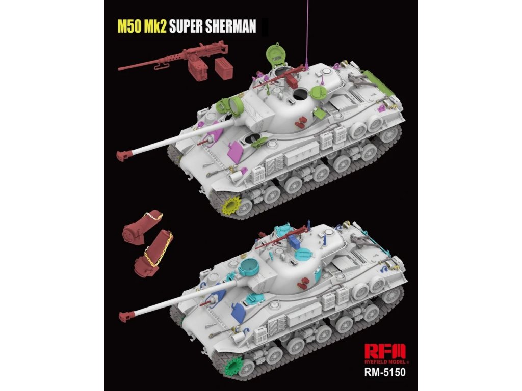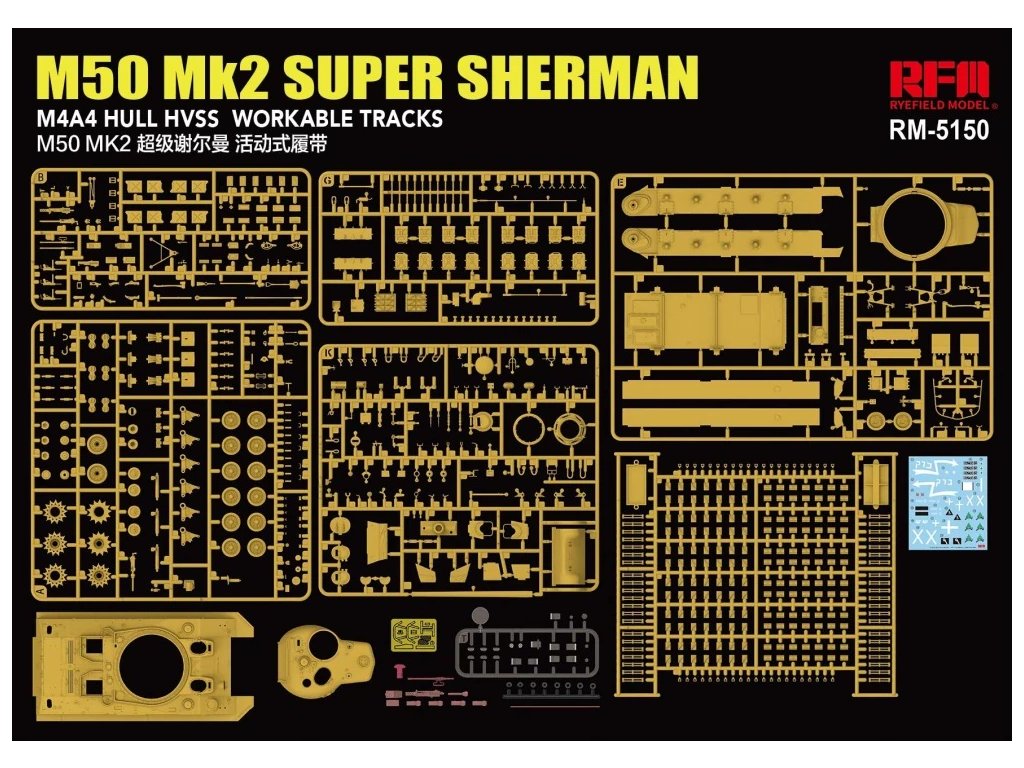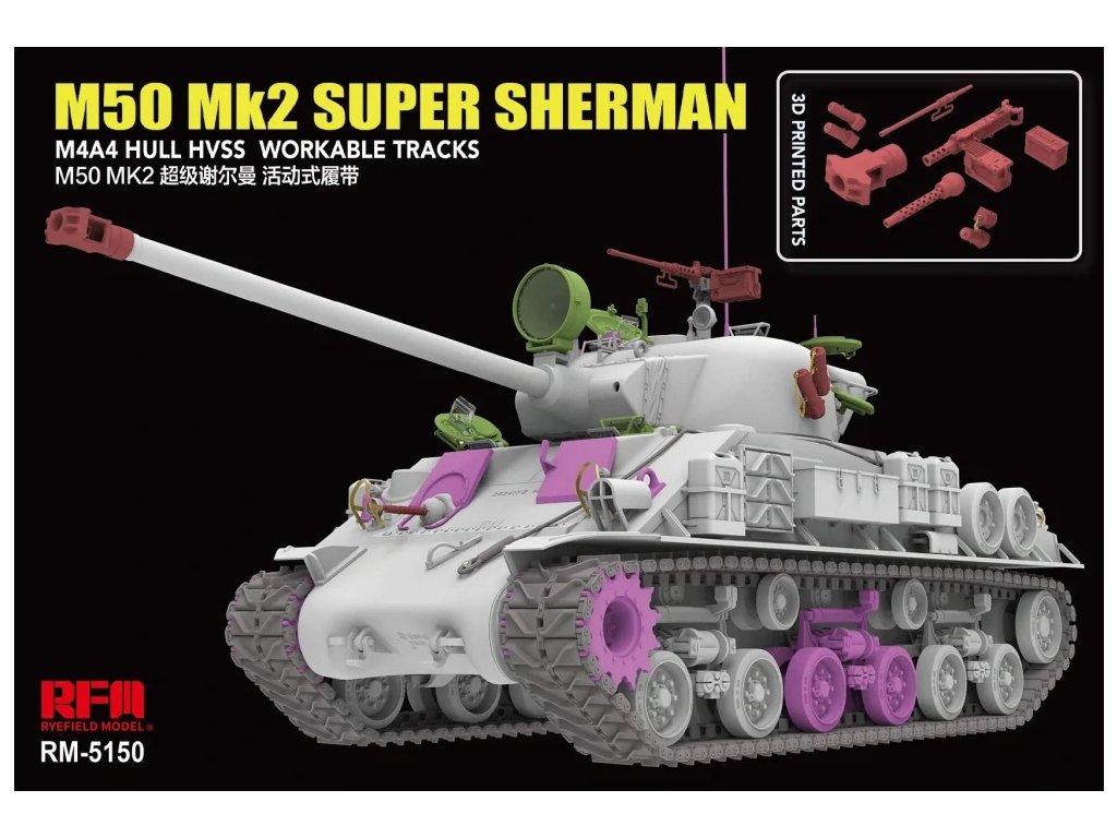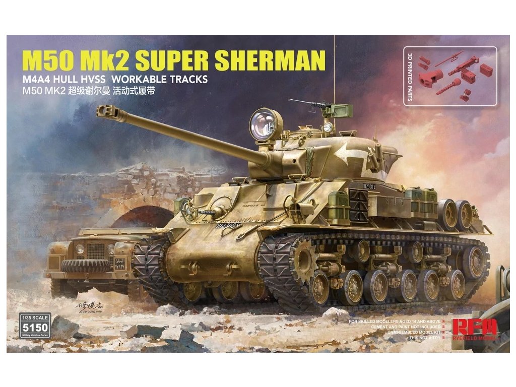 RFM RM-5114 M50 Mk2 Super Sherman (M4A4 Hull HVSS) Standard version 1/35 je plastikový model izraelského středního tanku z období 50. a 60. let 20. století určený ke slepení. Jedná se o modernizovanou verzi amerického Sherman s podvozkem HVSS (Horizontal Volute Spring Suspension) postavenou na trupu M4A4 a vyzbrojenou francouzským 75mm dělem CN 75-50. Super Sherman představoval významný upgrade původní konstrukce a sloužil v izraelské armádě během několika konfliktů včetně Suezské krize (1956) a Šestidenní války (1967). Měřítko 1:35 umožňuje detailní zpracování charakteristických prvků modernizace. Balení neobsahuje barvy ani lepidla potřebné k sestavení.