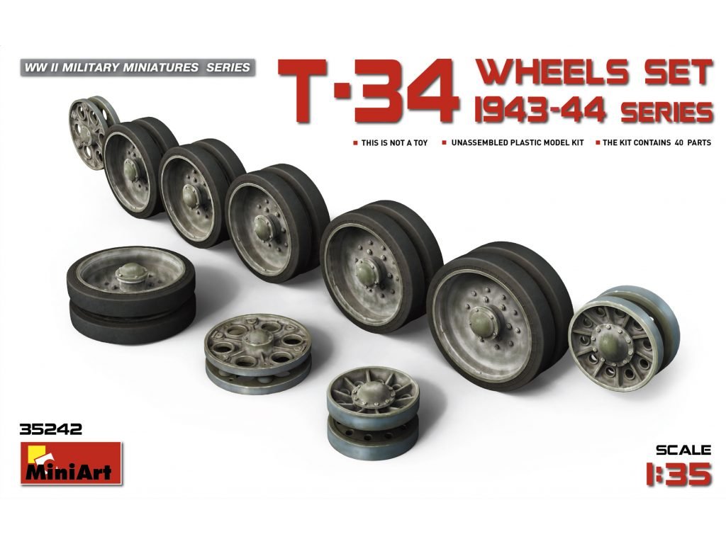 Sada T-34 Wheels Set 1943–44 Series v měřítku 1/35 od firmy MiniArt nabízí detailně zpracovaná pojezdová kola odpovídající verzím sovětského tanku T-34 vyráběným v letech 1943–44. Obsahuje různé typy disků a ráfků včetně odlévaných a lisovaných variant, které odpovídají historickým úpravám prováděným během válečné výroby v různých sovětských závodech.