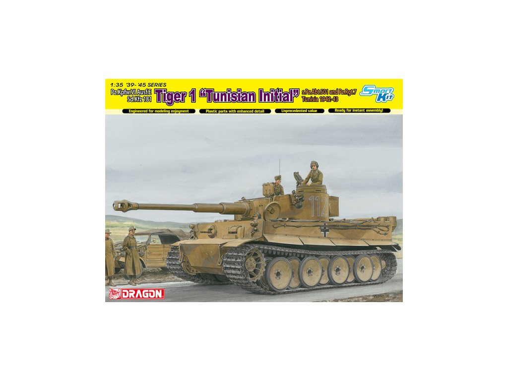Dragon 1/35 Tiger I Initial Production "Tunisian Initial Tiger" 1.kompanie s.Pz.Abt.501 DAK Tunisia 1942/43 je plastikový model německého těžkého tanku z období 2. světové války určený ke slepení. Stavebnice představuje Tiger I v rané produkční verzi ve výzbroji 1. roty těžkého tankového praporu 501 nasazeného v Tunisku v letech 1942–1943 v rámci Deutsches Afrikakorps (DAK). Měřítko 1:35 umožňuje detailní zpracování a je standardem pro vojenskou techniku. Balení neobsahuje barvy ani lepidla potřebné k sestavení.