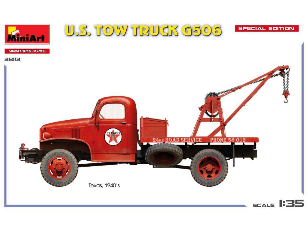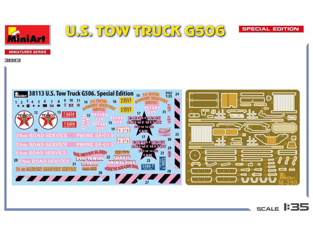 MiniArt 1/35 U.S. Tow Truck G506 (Special Edition) je detailní stavebnice vyprošťovacího/odtahového vozu na podvozku Chevroletu G506, tedy řady 1,5tunových nákladních aut široce používaných americkými jednotkami během 2. světové války. Mnoho těchto vozů bylo upraveno pro odtah a polní servis, a právě tato verze nabízí vyprošťovací rameno, naviják a servisní vybavení pro realistické dílenské nebo záchranné scény. Stavebnice přidává nové rámečky s vybavením (Ce_x1, Ab_x1, Ad_x1), má propracovaný interiér i podvozek, obsahuje leptané díly, čiré díly a obtisky pro více variant označení.