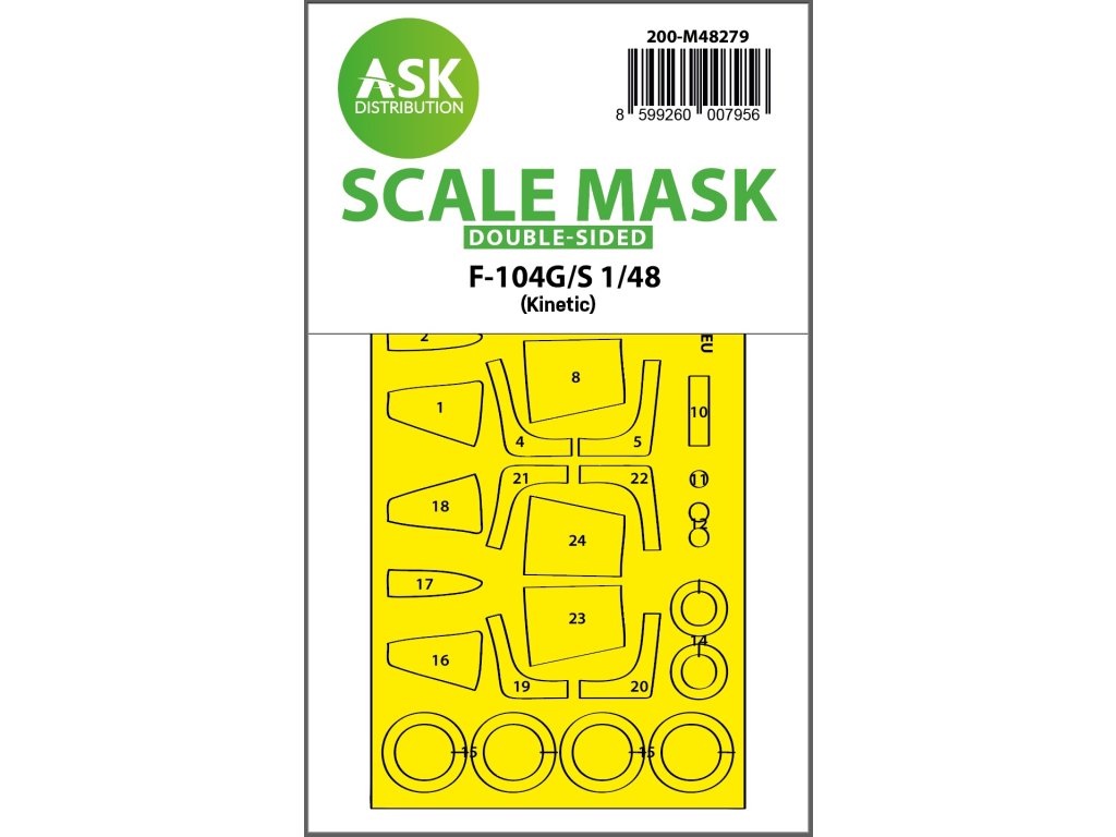 1/48 F-104G/S Starfighter, oboustranná samolepící fit maska čirých dílů a podvozkových kol pro stavebnici Kinetic. Katalogové číslo ASK Distribution: 200-M48279