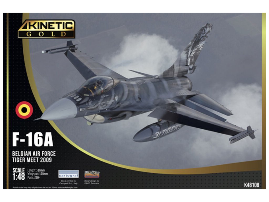 Speciální edice F-16A v měřítku 1/48 od Kinetic zachycuje letoun belgického letectva, který nesl výrazné tygří zbarvení během cvičení NATO Tiger Meet 2009. Akce je známá svými unikátními kamuflážemi a symbolizuje soudržnost jednotek s tygřím emblémem. Model nabízí precizně zpracovaný trup, kokpit s detaily přístrojové desky, podvěšenou výzbroj a kvalitní obtisky, které umožňují věrně reprodukovat slavné belgické zbarvení.