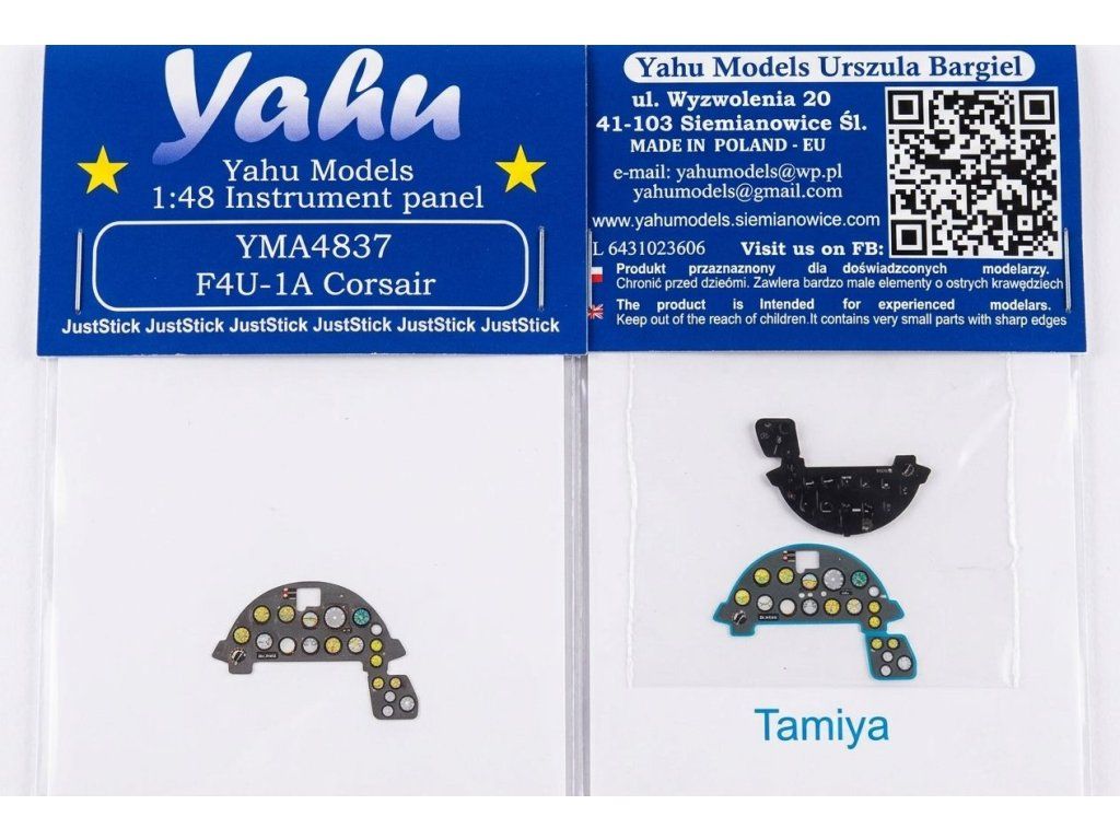 Yahu Model YMA4837 1/48 F4U-1A Corsair recommended for Tamiya Vought F4U-1A Corsair Photoetched instrument panels. Coloured. Ready to fit in a model (JustStick) (designed to be used with Tamiya kits) je barevný leptaný doplněk do kokpitu pro stavebnici Tamiya F4U-1A Corsair v měřítku 1:48. Sada obsahuje přístrojové panely s předbarveným povrchem a je určena jako detailní náhrada plastových dílů v interiéru modelu. Provedení JustStick znamená, že díly jsou připravené k přímému osazení do modelu. Balení neobsahuje stavebnici, barvy ani lepidlo.