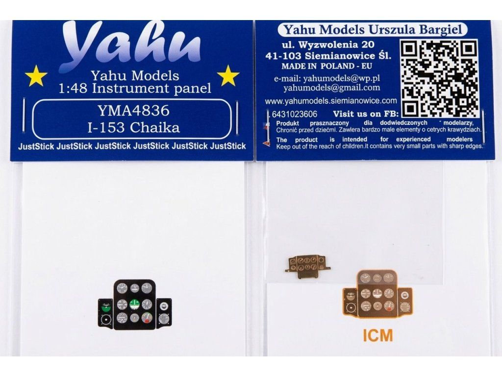 Yahu Models YMA4836 1/48 I-153 je barevná leptaná sada palubních desek pro model Polikarpov I-153 v měřítku 1:48, určená pro stavebnice ICM a AMG. Díly jsou předbarvené a připravené k okamžitému osazení do modelu v systému JustStick, což usnadňuje dosažení jemného a realistického vzhledu kokpitu. Sada je navržena pro sovětský dvouplošný stíhací letoun Polikarpov I-153 „Čajka“, používaný v předválečném období i během počáteční fáze 2. světové války. Balení neobsahuje stavebnici, barvy ani lepidla.