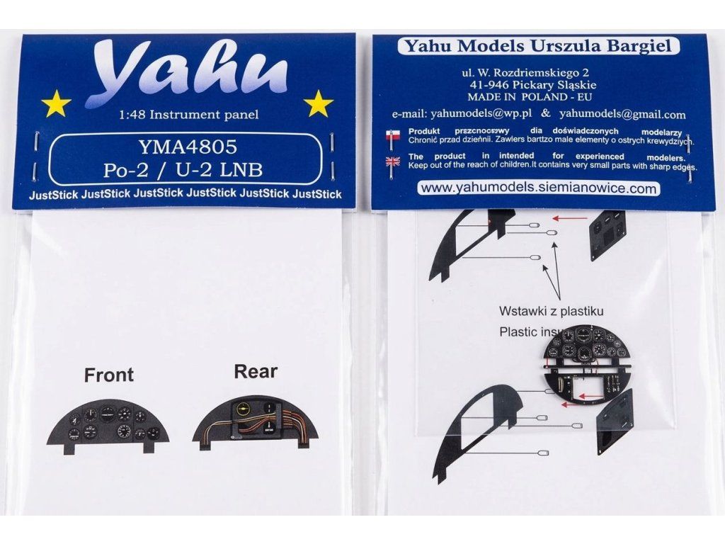 Yahu Model 1/48 Po-2 / U-2 LNB je barevný leptaný přístrojový panel určený pro stavebnici ICM Polikarpov Po-2 / U-2 LNB v měřítku 1:48. Díl je předem obarven a připraven k přímé montáži technologií JustStick — bez nutnosti dodatečného barvení. Je kompatibilní se stavebnicemi ICM v řadě U-2/Po-2, U-2/Po-2VS a U-2/Po-2.