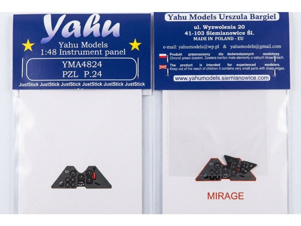 Sada Yahu Model YMA4824 obsahuje fotoleptem zpracované přístrojové desky v měřítku 1:48, které jsou předem kolorovány, takže věrně napodobují vzhled skutečných přístrojů bez nutnosti ručního dobarvování. Technologie JustStick zajišťuje snadnou montáž — díly jsou připraveny k přímému vložení do kokpitu modelu. Sada je konstruována jako přímá náhrada originálních plastových dílů stavebnice Mirage a výrazně zvyšuje detailnost a věrohodnost výsledného modelu.