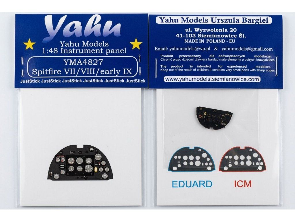 YahuModel YMA4827 je sada barevných leptaných přístrojových desek v měřítku 1:48 pro Supermarine Spitfire Mk.VII, Mk.VIII a raný Mk.IXc/Mk.IXe. Sada je navržena pro stavebnice Eduard a ICM a díky technologii JustStick je připravena k přímé montáži bez nutnosti dalšího barvení. Balení neobsahuje lepidlo.