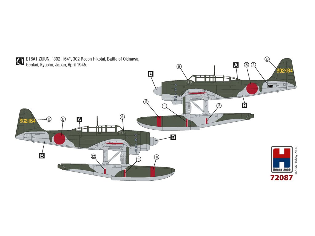 Měřítko 1:72 nabízí dobrý kompromis mezi detailností a prostorovou úsporností, přičemž hydroplán s pontony vytváří vizuálně zajímavou siluetu vhodnou pro vitrínovou prezentaci i tematická dioráma (například paluba křižníku, katapultový start, pobřežní základna). U japonských strojů se obvykle uplatní tmavě zelené horní plochy s šedými spodními, případně přírodní kovový povrch u pozdějších verzí, doplněné o červené hinomaru a případné taktické označení. Balení neobsahuje barvy ani lepidla potřebné k sestavení.