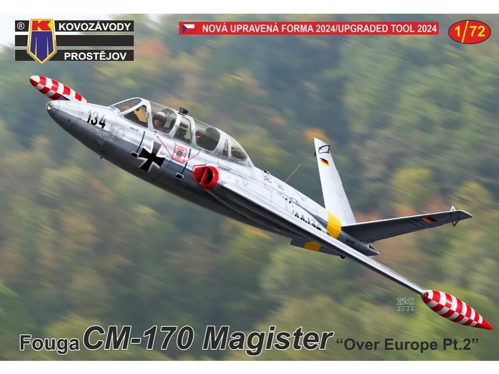 Model Fouga CM-170 Magister "Over Europe Pt.2" v měřítku 1/72 od společnosti Kovozávody Prostějov (KPM) představuje francouzský cvičný proudový letoun, který byl široce používán v evropských letectvech během studené války. Tato sada obsahuje detailně zpracované plastové díly, realistický kokpit, jemné povrchové detaily a obtisky pro tři různé markingy: