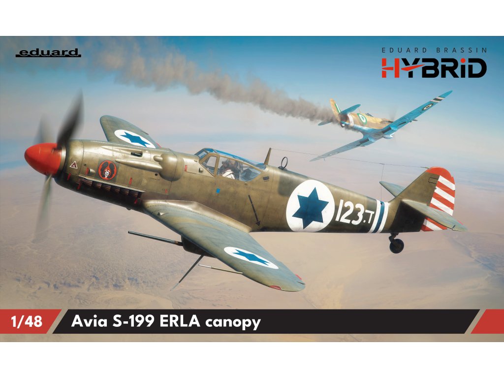 Eduard 1/48 Avia S-199 Erla Hybrid představuje plastovou stavebnici československého poválečného jednomotorového stíhacího letounu, vycházejícího z konstrukce německého Bf 109G. Tato edice z nové řady HYBRID kombinuje klasické plastové díly s 3D tištěnými komponenty, čímž spojuje jednoduchost stavby s mimořádnou úrovní detailu. Verze s překrytem kabiny typu Erla nabízí šest kamuflážních schémat a výborně zachycuje charakteristické rysy československého stíhacího letounu z konce 40. let.
