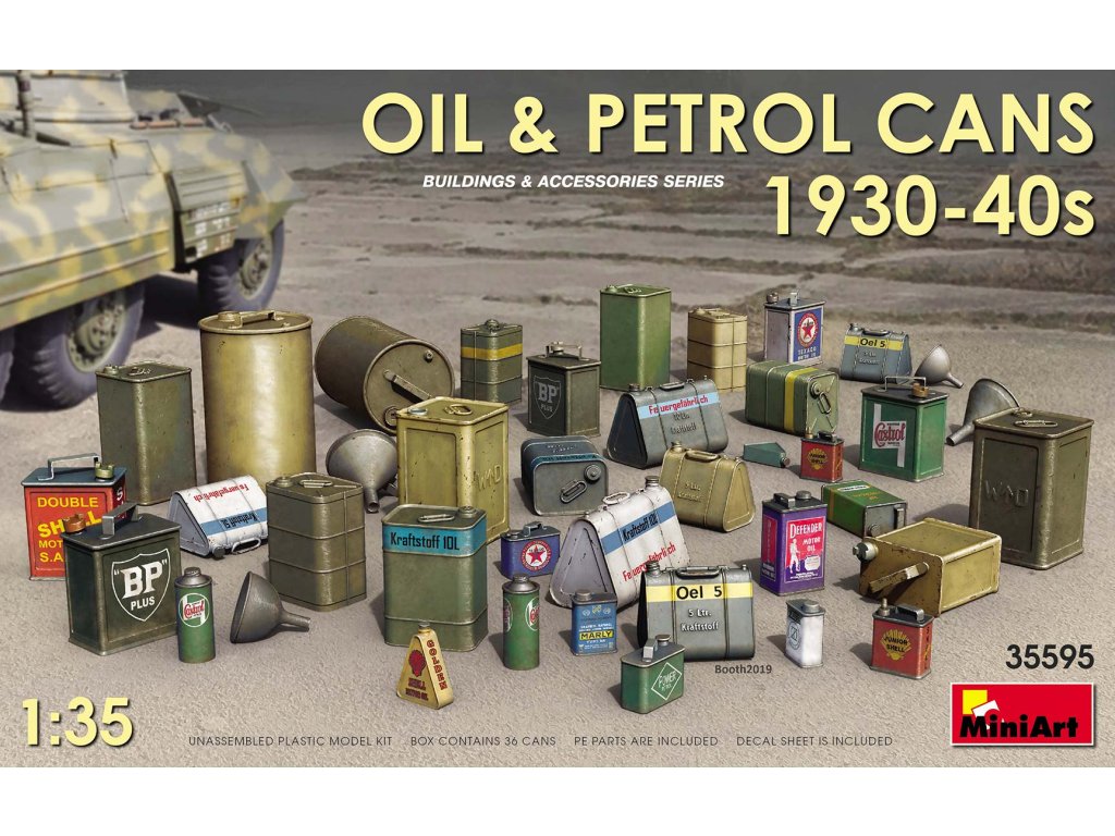 Der Bausatz Oil & Petrol Cans 1930-40s von MiniArt im Massstab 1:35 enthält Plastikteile zum Bau einer Vielzahl vonverschiedener Kraftstoff- und Schmiermittelbehälter aus Metall aus der Zwischenkriegszeit und dem Zweiten Weltkrieg. Die Kanister und Kannen in diesem Set spiegeln Designs aus verschiedenen Ländern wider - zum Beispiel aus Deutschland, Großbritannien, den USA und der Sowjetunion.Union - und umfassen sowohl militärische 20-Liter-Standardkanister als auch kleinere zivile Behälter.