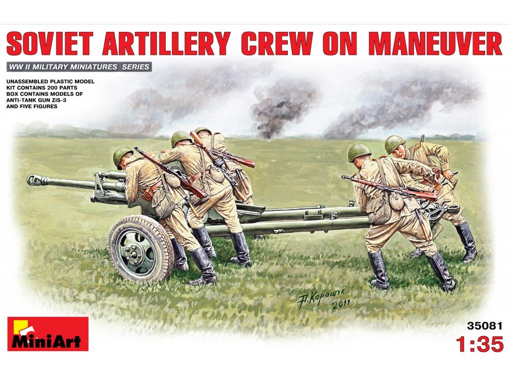 Das Modellset Soviet Artillery Crew on Maneuver im Maßstab 1:35 stellt eine Gruppe sowjetischer Artilleristen während einer Übung oder Bewegung dar. Die Figuren sind in dynamischen Posen mit realistischer Ausrüstung dargestellt. Farbe und Kleber für den Zusammenbau sind nicht im Lieferumfang enthalten.