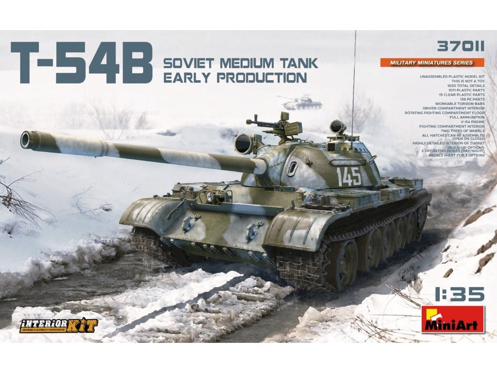 Der T-54B ist ein Modell eines sowjetischen mittleren Panzers aus den 1950er Jahren im Maßstab 1:35 mit vollständig detaillierter Innenausstattung. Die B-Version war mit einem verbesserten Visiersystem und Nachtsichtgeräten ausgestattet. Der detaillierte Bausatz von MiniArt gibt die Technologie des Kalten Krieges in hoher Qualität wieder. Farbe und Kleber für den Zusammenbau sind nicht im Lieferumfang enthalten.