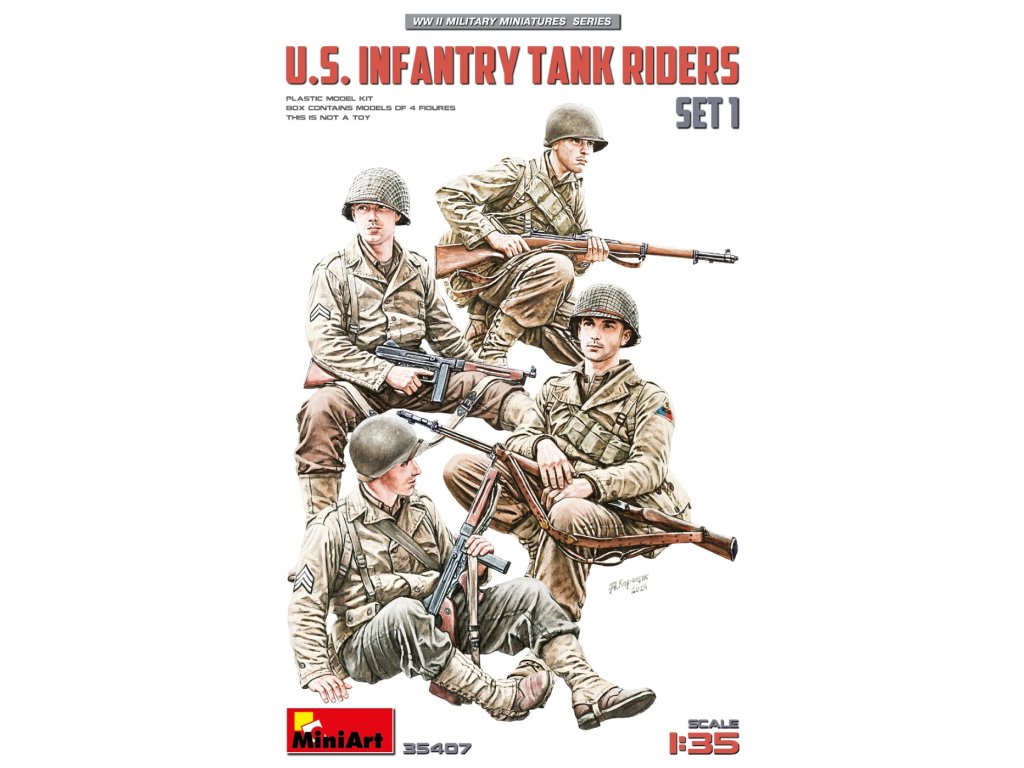 MiniArt 1/35 U.S. Infantry Tank Riders. Set 1 enthält fünf detaillierte Figuren von US-Soldaten in Bewegung, sitzend oder in gepanzerten Fahrzeugen. Jede Figur verfügt über authentische Uniformen, Ausrüstung und Panzerung, die der späten Kriegszeit entsprechen. Das Modell enthält realistische Details wie M1-Helme, Halfter, M1-Karabiner und M1-Garand-Gewehre, die zur historischen Genauigkeit beitragen.
