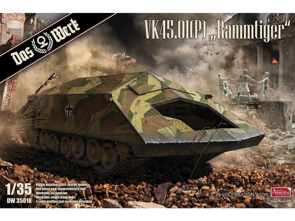 Das Werks Modell des VK4501(P) "Rammtiger" im Maßstab 1:35 ist eines der interessantesten und am wenigsten verbreiteten Konstruktionen des Zweiten Weltkriegs. Das Fahrzeug basiert auf dem Fahrgestell des Porsche Tiger (VK4501(P)) und wurde angeblich als schwer gepanzertes Rammfahrzeug entwickelt - ein Fahrzeug, das Befestigungen, Barrikaden und andere Hindernisse durch direkten Aufprall zerstören sollte.
