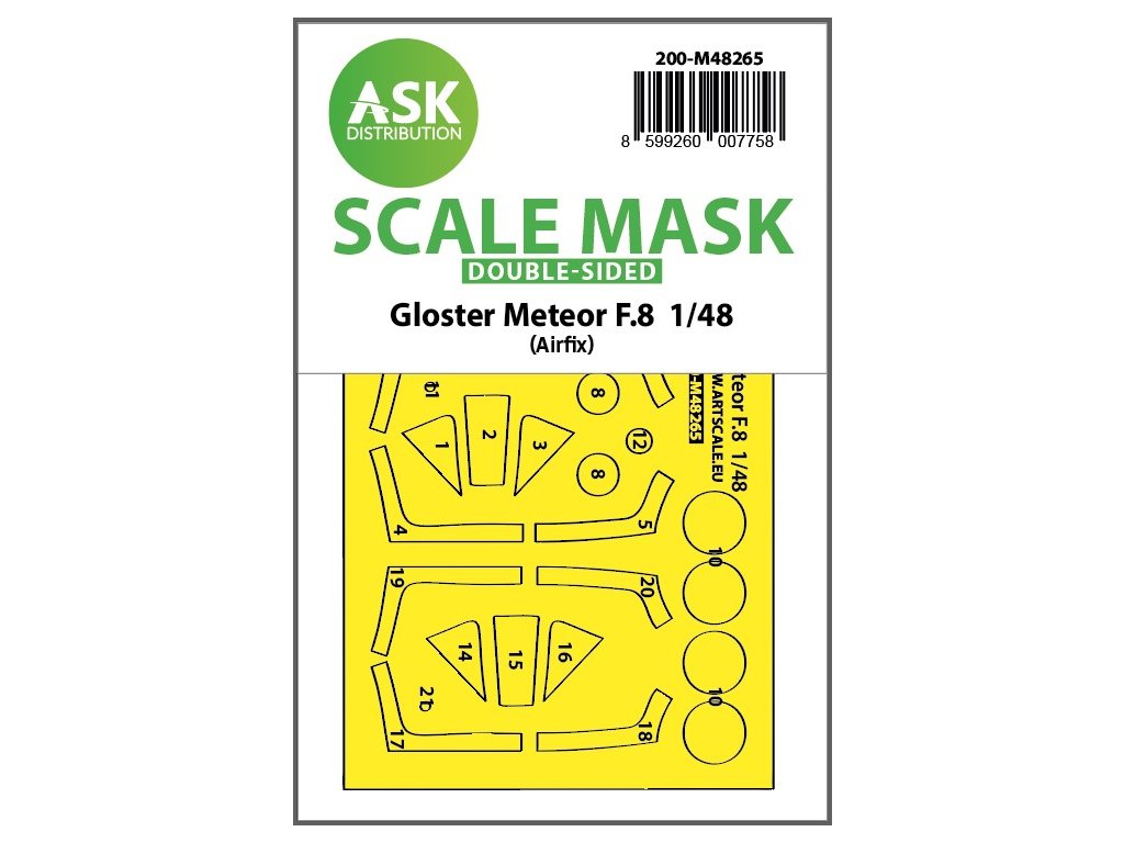 Art Scale Kit Distribution (ASK) stellt vorgestanzte und nummerierte Abdeckbögen für Plastikmodelle her. Die Masken sind in erster Linie für das Abkleben von Kabinen und Rädern gedacht, erleichtern aber auch das Abkleben anderer Teile des Modells. Jedes Kit wird für einen bestimmten Modellbausatz im entsprechenden Maßstab empfohlen, um maximale Genauigkeit und Benutzerfreundlichkeit zu gewährleisten.