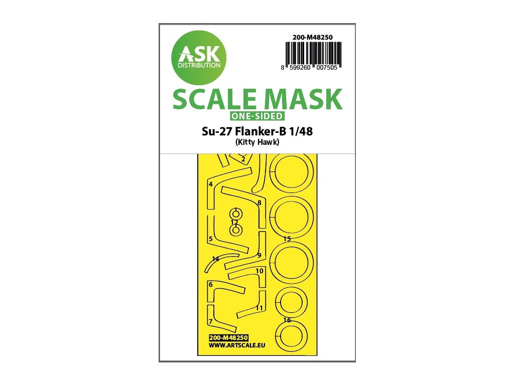Art Scale Kit Distribution (ASK) stellt vorgestanzte und nummerierte Abdeckbögen für Plastikmodelle her. Die Masken sind in erster Linie für das Abkleben von Kabinen und Rädern gedacht, erleichtern aber auch das Abkleben anderer Teile des Modells. Jedes Kit wird für einen bestimmten Modellbausatz im entsprechenden Maßstab empfohlen, um maximale Genauigkeit und Benutzerfreundlichkeit zu gewährleisten.