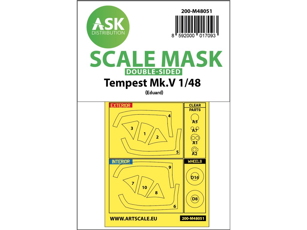 Art Scale Kit Distribution (ASK) stellt vorgestanzte und nummerierte Abdeckbögen für Plastikmodelle her. Die Masken sind in erster Linie für das Abkleben von Kabinen und Rädern gedacht, erleichtern aber auch das Abkleben anderer Teile des Modells. Jedes Kit wird für einen bestimmten Modellbausatz im entsprechenden Maßstab empfohlen, um maximale Genauigkeit und Benutzerfreundlichkeit zu gewährleisten.