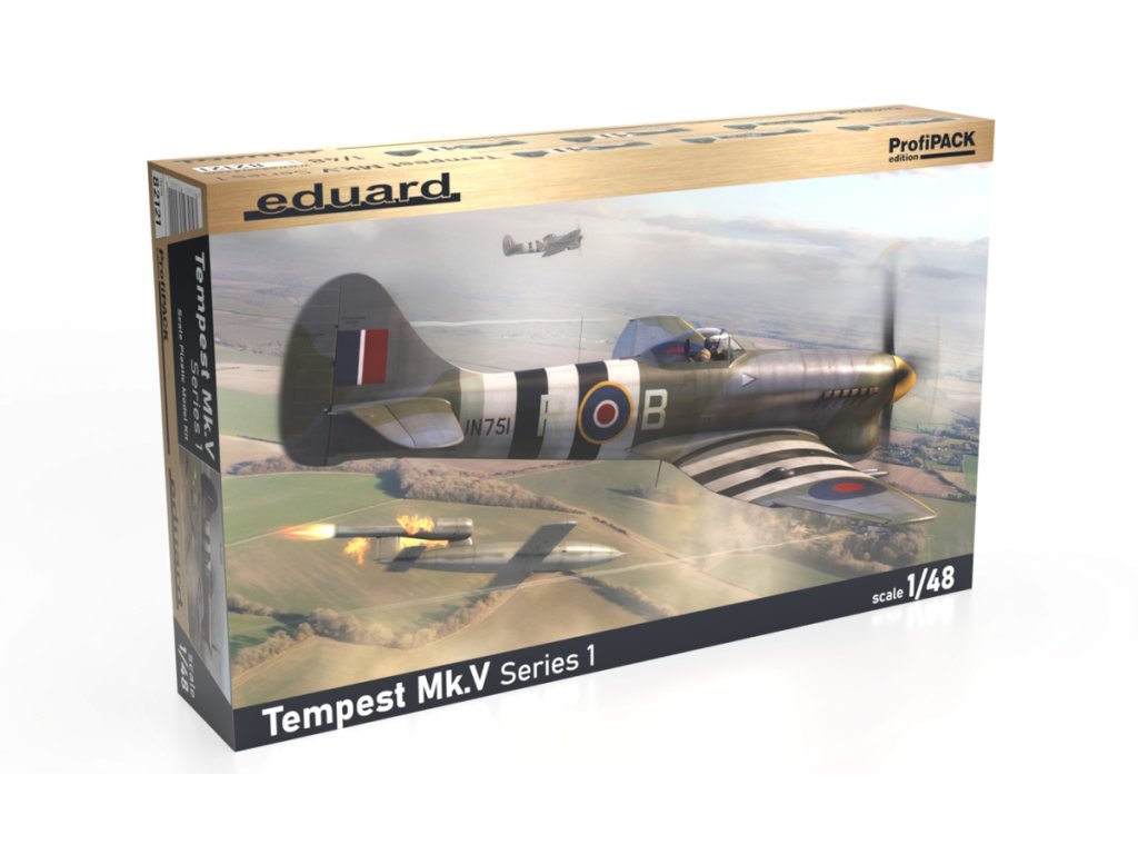 Eduard Tempest Mk.V Series 1 Bausatz im Maßstab 1/48 (Kat. 82121) aus der ProfiPACK-Edition enthält detaillierte Kunststoffteile, farbig geätztes Zubehör, vorgestanzte Masken und Abziehbilder für sechs authentische Tarnschemen. Zu den angebotenen Varianten gehören: