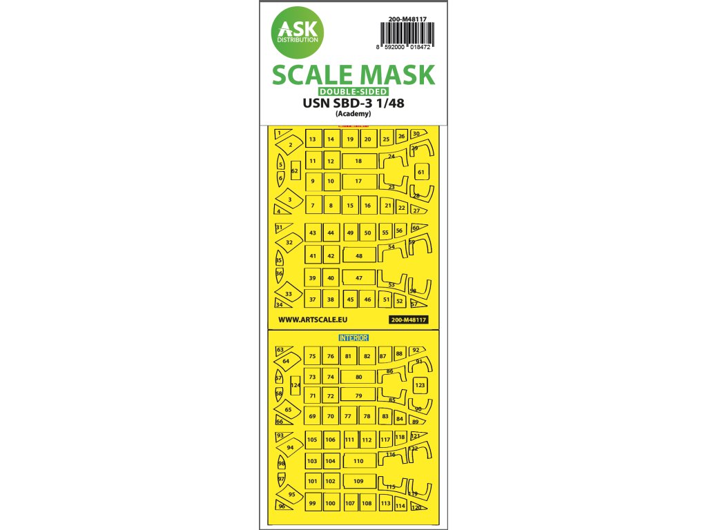 Art Scale Kit Distribution (ASK) stellt vorgestanzte und nummerierte Abdeckbögen für Plastikmodelle her. Die Masken sind in erster Linie für das Abkleben von Kabinen und Rädern gedacht, erleichtern aber auch das Abkleben anderer Teile des Modells. Jedes Kit wird für einen bestimmten Modellbausatz im entsprechenden Maßstab empfohlen, um maximale Genauigkeit und Benutzerfreundlichkeit zu gewährleisten.