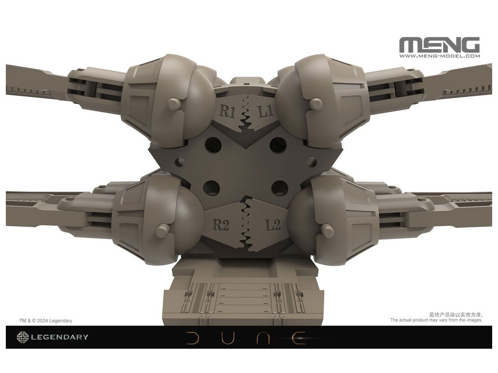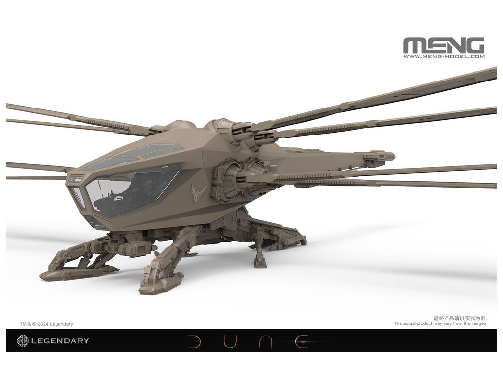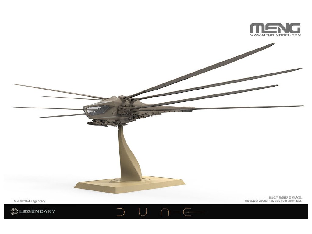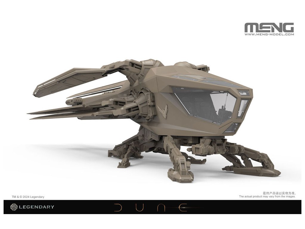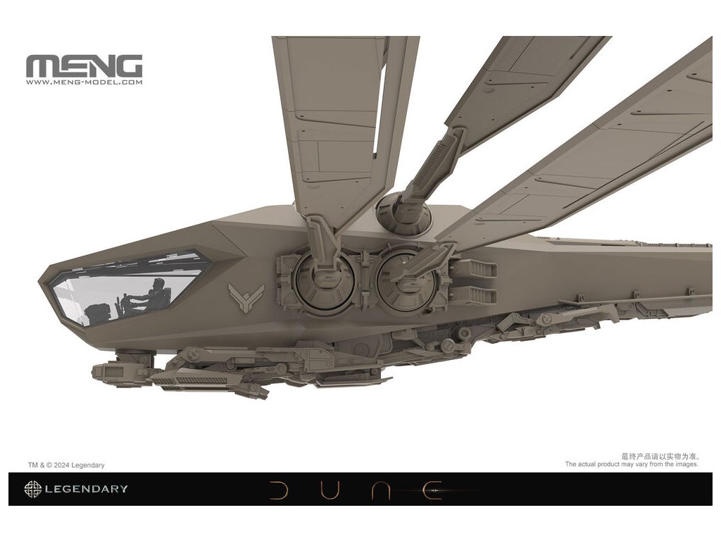Plastikmodell des Atreides Ornithopters aus dem Film DUNE im Maßstab 1:72. Detailliertes Modell mit beweglichen Flügeln, Fahrwerk und Besatzungsfiguren. Der Bausatz enthält weder Klebstoff noch Farbe.