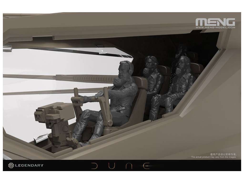 Der Bausatz enthält vier Besatzungsfiguren, ein detailliertes Cockpit mit Klarsichtteilen und weiteres Kleinzubehör. Das Modell ist ein ideales Sammlerstück für Fans der Welt von DUNE und Modellbauer mit einem Faible für Sci-Fi-Technik.