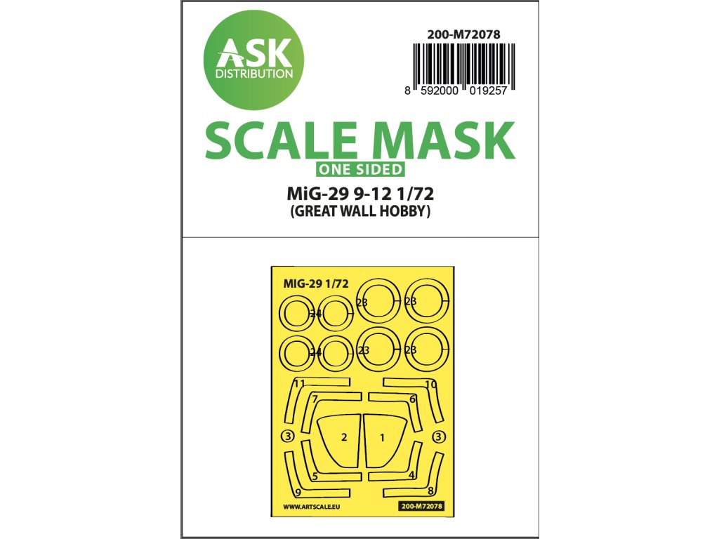Art Scale Kit Distribution (ASK) stellt vorgestanzte und nummerierte Abdeckbögen für Plastikmodelle her. Die Masken sind in erster Linie für das Abkleben von Kabinen und Rädern gedacht, erleichtern aber auch das Abkleben anderer Teile des Modells. Jedes Kit wird für einen bestimmten Modellbausatz im entsprechenden Maßstab empfohlen, um maximale Genauigkeit und Benutzerfreundlichkeit zu gewährleisten.