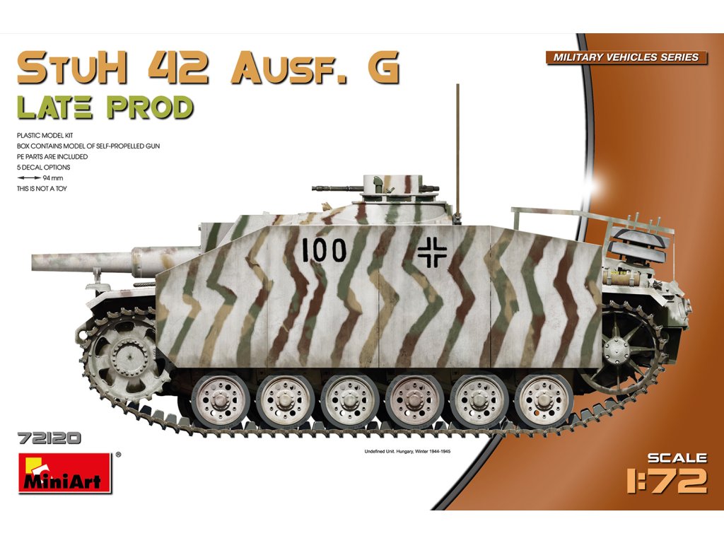 MiniArt 1/72 StuH 42 Ausf. G Late Production ist ein Plastikbausatz einer deutschen Panzerhaubitze aus dem Ende des Zweiten Weltkriegs im Maßstab 1/72. Die späte Version, basierend auf dem StuG III Fahrgestell, trug eine 105mm Haubitze und war ein effektives Mittel zur Feuerunterstützung für die Infanterie.