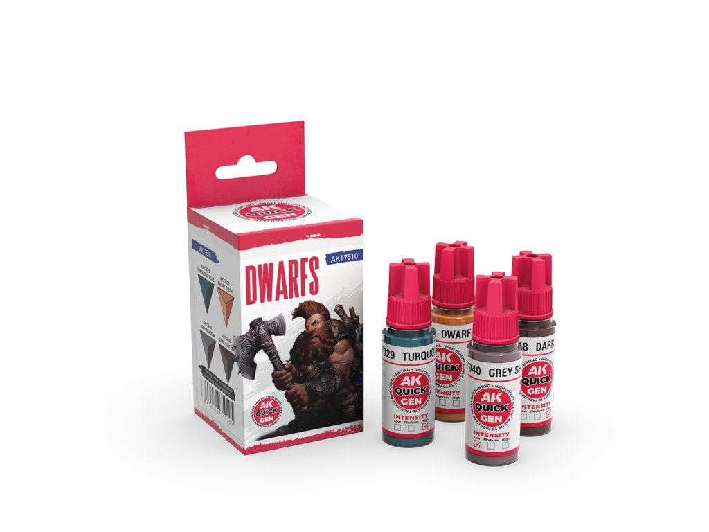 Das QUICK GEN Set für Zwergenarmeen bietet speziell ausgewählte Farbtöne, die sich ideal zum Bemalen von Figuren und Armeen eignen. Dank der einzigartigen Pigmente decken die Farben perfekt und erzeugen kräftige Details in nur einer Schicht.