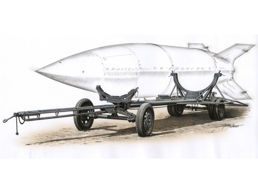 Das Modell im Maßstab 1:72 bietet präzise Details der Transportstruktur, des Fahrgestells und der Schleppvorrichtung und ist damit dem historischen Original treu. Ideal für Modellbauer mit Interesse an deutscher Raketentechnik und Logistik im Zweiten Weltkrieg.
