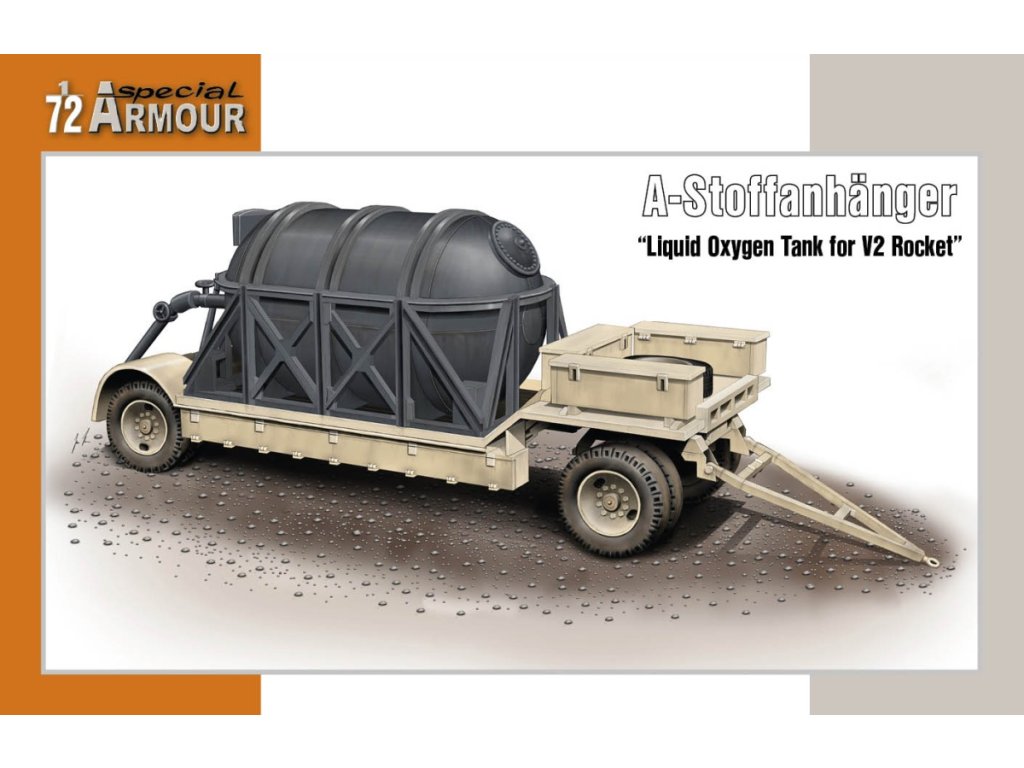 A-Stoffanhänger Flüssigsauerstofftank für V2-Rakete im Maßstab 1/72 von Special Hobby stellt einen speziellen deutschen Tankanhänger dar der für den Transport von Flüssigsauerstoff ausgelegt ist, der eine Schlüsselkomponente des Treibstoffsystems der ballistischen V-2-Rakete war. Die V-2-Raketen verwendeten flüssigen Sauerstoff als Oxidationsmittel, das bei extrem niedrigen Temperaturen transportiert und gelagert werden musste, was spezielle logistische Lösungen erforderte.