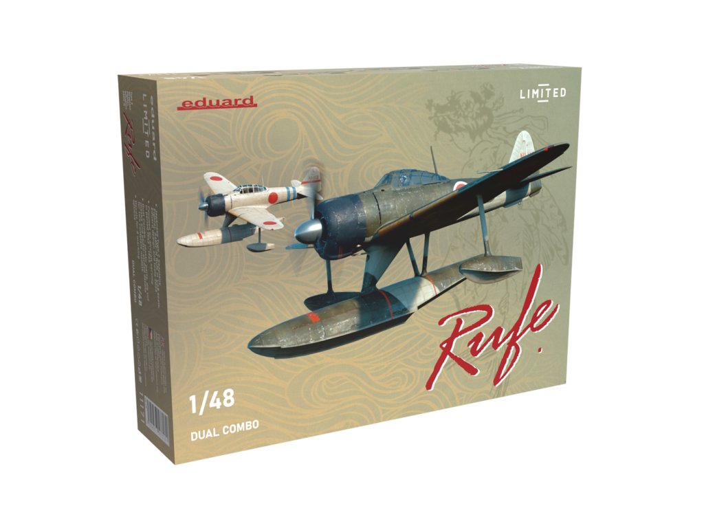 Eduard RUFE DUAL COMBO 1/48 ist ein limitierter Bausatz von zwei japanischen A6M2-N "Rufe" Wasserflugzeugen aus dem Zweiten Weltkrieg, entworfenEr enthält detaillierte Plastikteile, farbig geätztes Zubehör, Masken und acht Tarnschemen. Das Paket enthält nicht die Farbe oder Klebstoffe für den Zusammenbau benötigt.