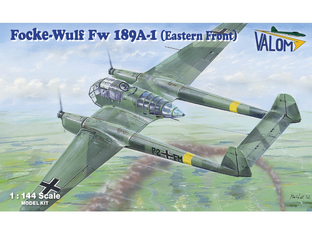 1/144th scale plastic model of Focke-Wulf Fw 189A-1 (Eastern Front) by Valom. Kit of German WWII reconnaissance aircraft, deployed mainly on the Eastern Front. Includes plastic parts, decals and instructions.