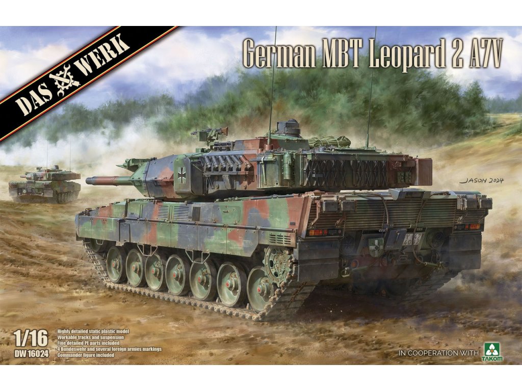 Das Werk 1/16 Leopard 2 A7V is a large and detailed 1/16 scale model of the modern German main battle tank. Produced for the Bundeswehr and foreign armies, the Leopard 2 A7V represents the latest version of the famous Leopard 2 tank, known for its firepower, advanced electronics and excellent protection. The kit features elaborate details, movable tracks and hinges, photo-etched parts and a commander figure.