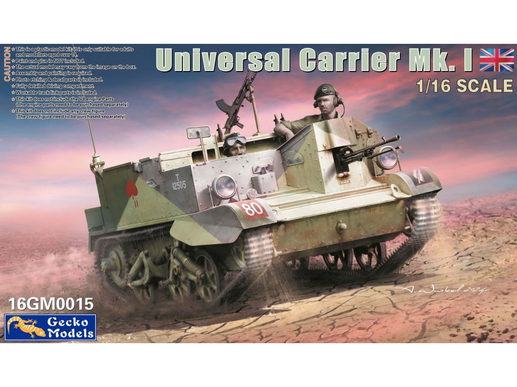 Detailed plastic kit of British light armoured personnel carrier Universal Carrier Mk.I in 1/16 scale by Gecko Models. This legendary tracked multi-purpose troop carrier, developed from the Bren Gun Carrier, was used during the second World War II, it was used extensively by the Allied armies to transport troops, materiel or tow light guns.
