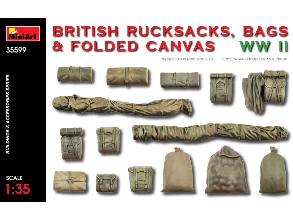 MiniArt 1/35 British Rucksacks, Bags & Folded Canvas WW2 is a set of satchels, bags and tarpaulins for British troops during WW2. The package does not include the paint or glue needed for assembly.