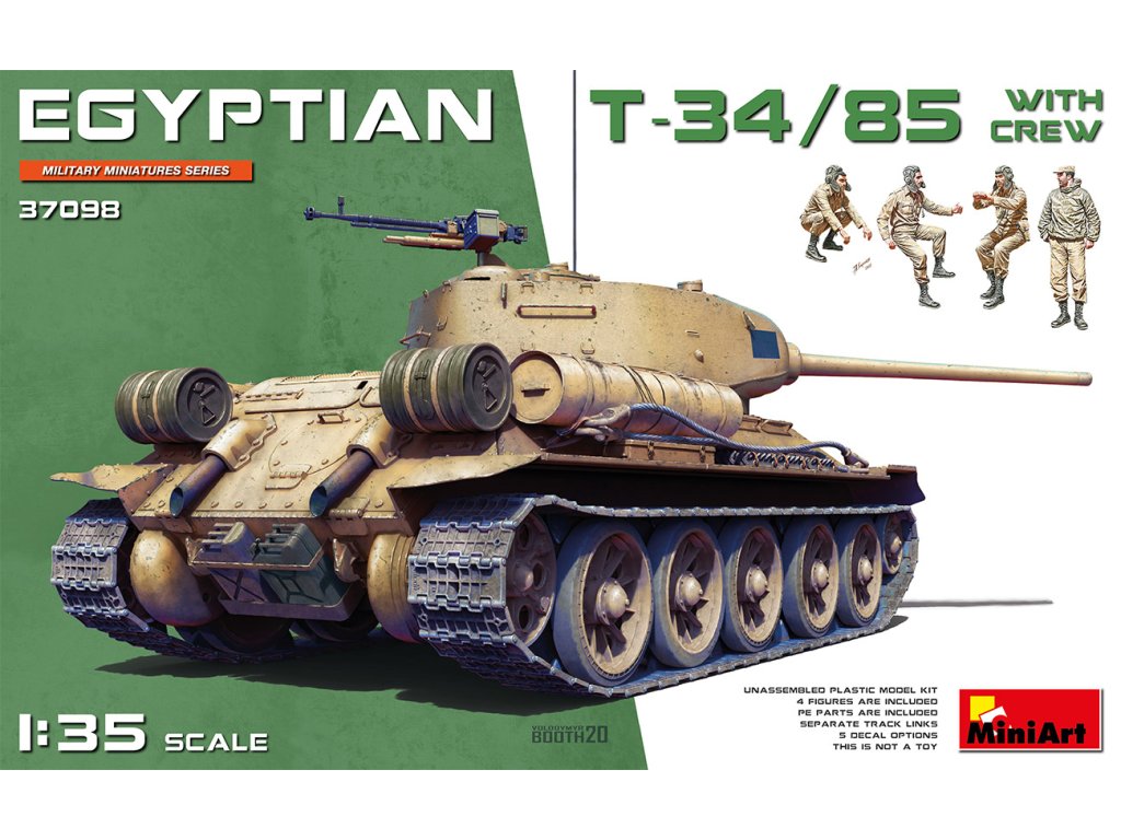 MiniArt presents the Egyptian T-34/85 w/crew in 1/35 scale as a highly detailed kit, complete with figures of the Egyptian tank crew in period uniforms. The kit offers a wealth of realistic detail including variant parts matching Egyptian modifications and decals for specific machines. The combination of an elaborate model and figures makes it an ideal choice for creating authentic scenes of the Middle East in the 1950-1970s.