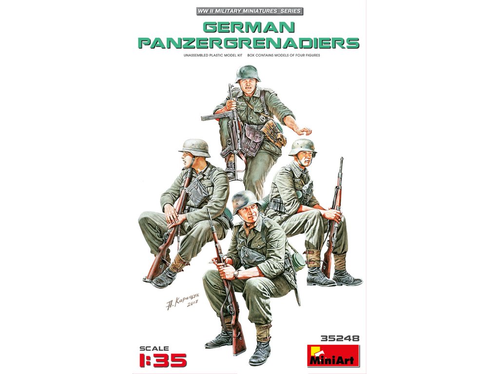 MiniArt's 1/35 German Panzergrenadiers features German infantry figures in WWII battle positions. The set includes detailed figures with armament and equipment. Package does not include paint or glue needed for assembly.